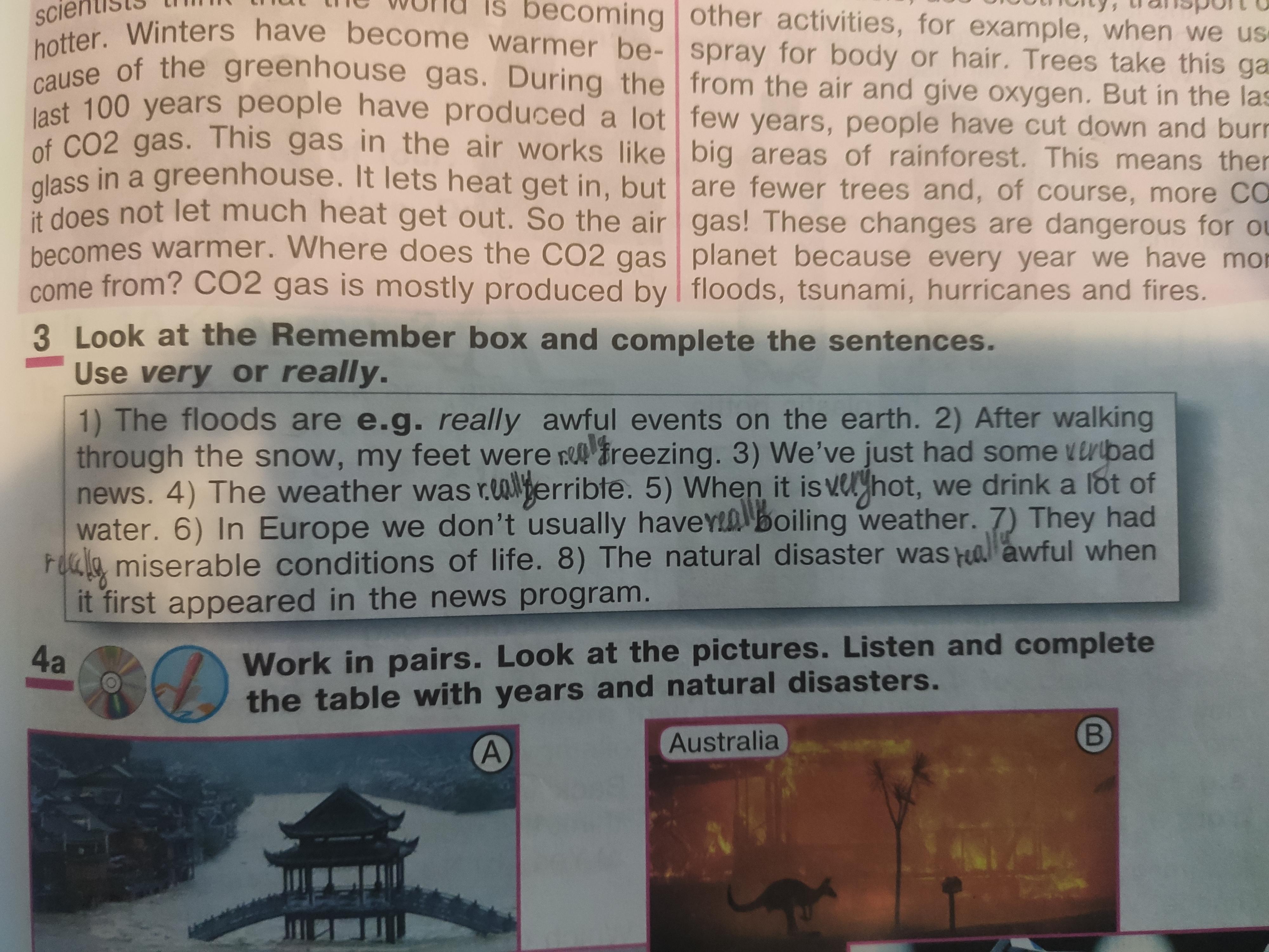 3 Look at the Remember box and complete the sentences. Use very or really. 1) The floods are e.g. really awful events on the earth. 2) After walking through the snow, my feet were ... freezing. 3) We've just had some ... bad news. 4) The weather was ... terrible. 5) When it is ... hot, we drink a lot of water. 6) In Europe we don't usually have ... boiling weather. 7) They had miserable conditions of life. 8) The natural disaster was ... awful when it first appeared in the news program.
