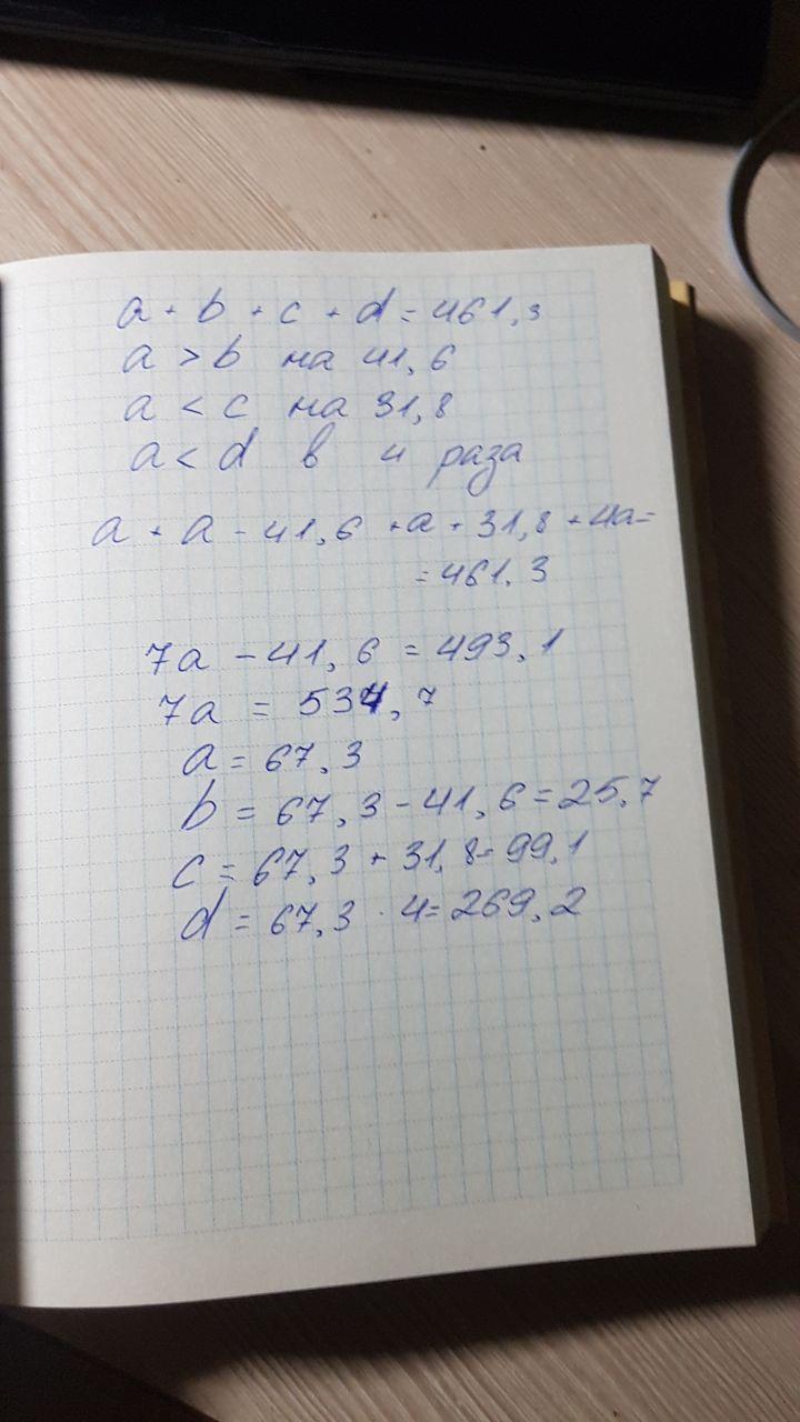 Сумма четырех чисел равна 461,3. Одно из этих чисел на 41,6 больше второго, на 31,8 меньше третьего и в 4 раза меньше четвертого. Найти эти числа.