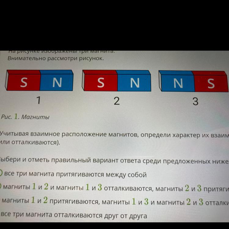 Ответ: магниты 1 и 2 притягиваются, а магниты 2 и 3 и магниты 1 и 3 отталкиваются