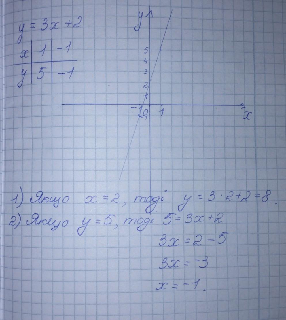 Побудуйте графiк функцii у=3х+2. Користуючись графiком,знайдiть:1) значення функцii,якщо значення аргументу дорiвнює х= 2;. 2)значення аргументу,при якому у=5