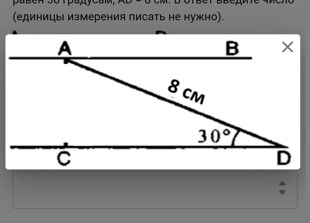 Прямая АВ параллельна прямой CD. Найдите расстояние между этими прямыми, если угол ADC равен 30 градусам, AD = 8 см. В ответ введите число