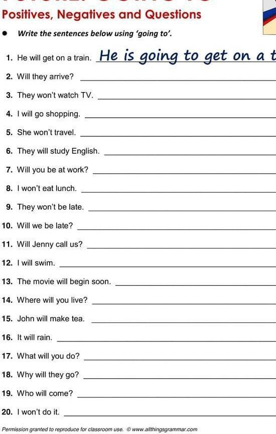 2. Will they arrive? 3. They won't watch TV. 4. I will go shopping. 5. She won't travel. 6. They will study English. 7. Will you be at work? 8. I won't eat lunch. 9. They won't be late. 10. Will we be late? 11. Will Jenny call us? 12. I will swim. 13. The movie will begin soon. 14. Where will you live? 15. John will make tea. 16. It will rain. 17. What will you do? 18. Why will they go? 19. Who will come? 20. I won't do it.