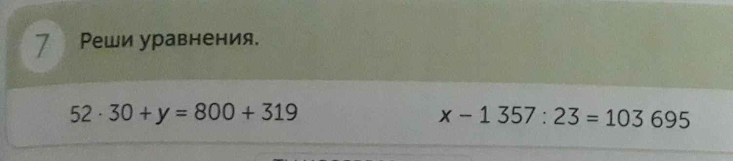 7 Реши уравнения. 52. 30 + y = 800 + 319 x - 1 357:23 = 103 695