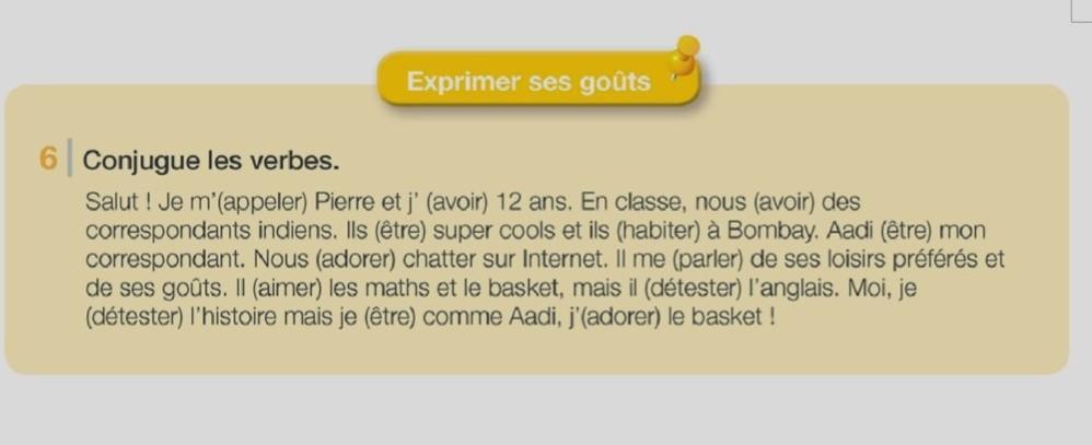 Salut ! Je m'appelle Pierre et j'ai 12 ans. En classe, nous avons des correspondancants indiens. Ils sont super cools et ils habitent à Bombay. Aadi est mon correspondant. Nous adorons chatter sur Internet. Il me parle de ses loisir préfèrés et de ses goûts. Il aime les maths et le baskets , mais il déteste l'anglais. Moi, je déteste l'histoire mais je suis comme Aadi, j'adore le basket !
