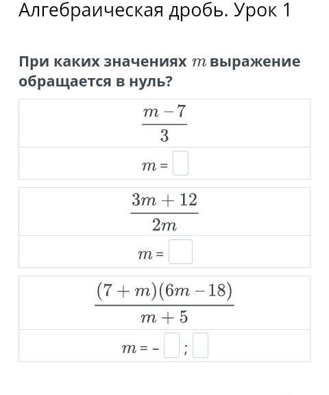 Алгебраическая дробь. Урок 1 При каких значениях m выражение обращается в нуль? помогите с алгеброй пж