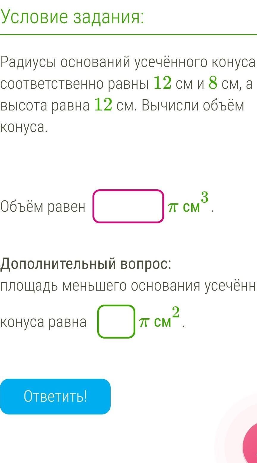 V зр = 1/3 πH( R² + Rr + r² ) ; R = 12 cм ; r = 8 cм ; H = 12 cм ; V зр - ?