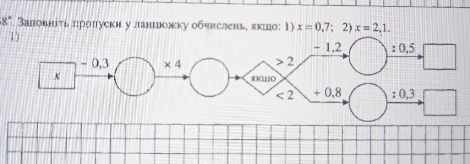 . Заповніть пропуски у ланцюжку обчислень, якщо: 1) х = 0,7; 2) х = 2,1. 1) - 1.2 : 0,5 0,3 x 4 > 2 ЯКЩО С О) 2 + 0,8 :0,3