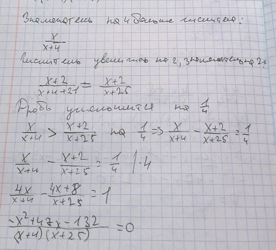 Знаменатель несократимой обыкновенной дроби на 4 больше её числителя. Если числитель этой дроби увеличить на 2, а знаменатель – на 21, то дробь уменьшится на 1/4. Найдите эту дробь. Обратите внимание, именно 21, а не 25