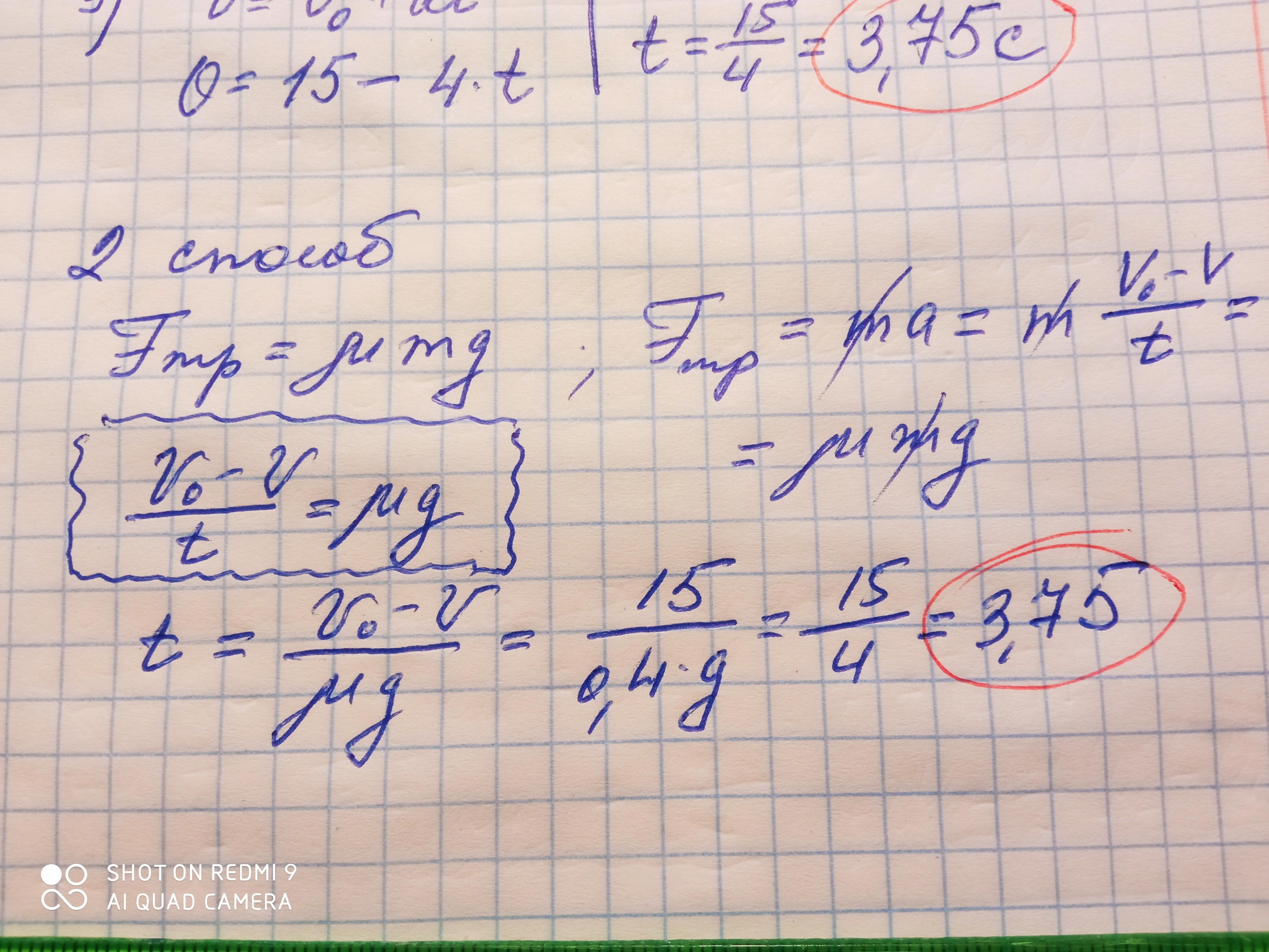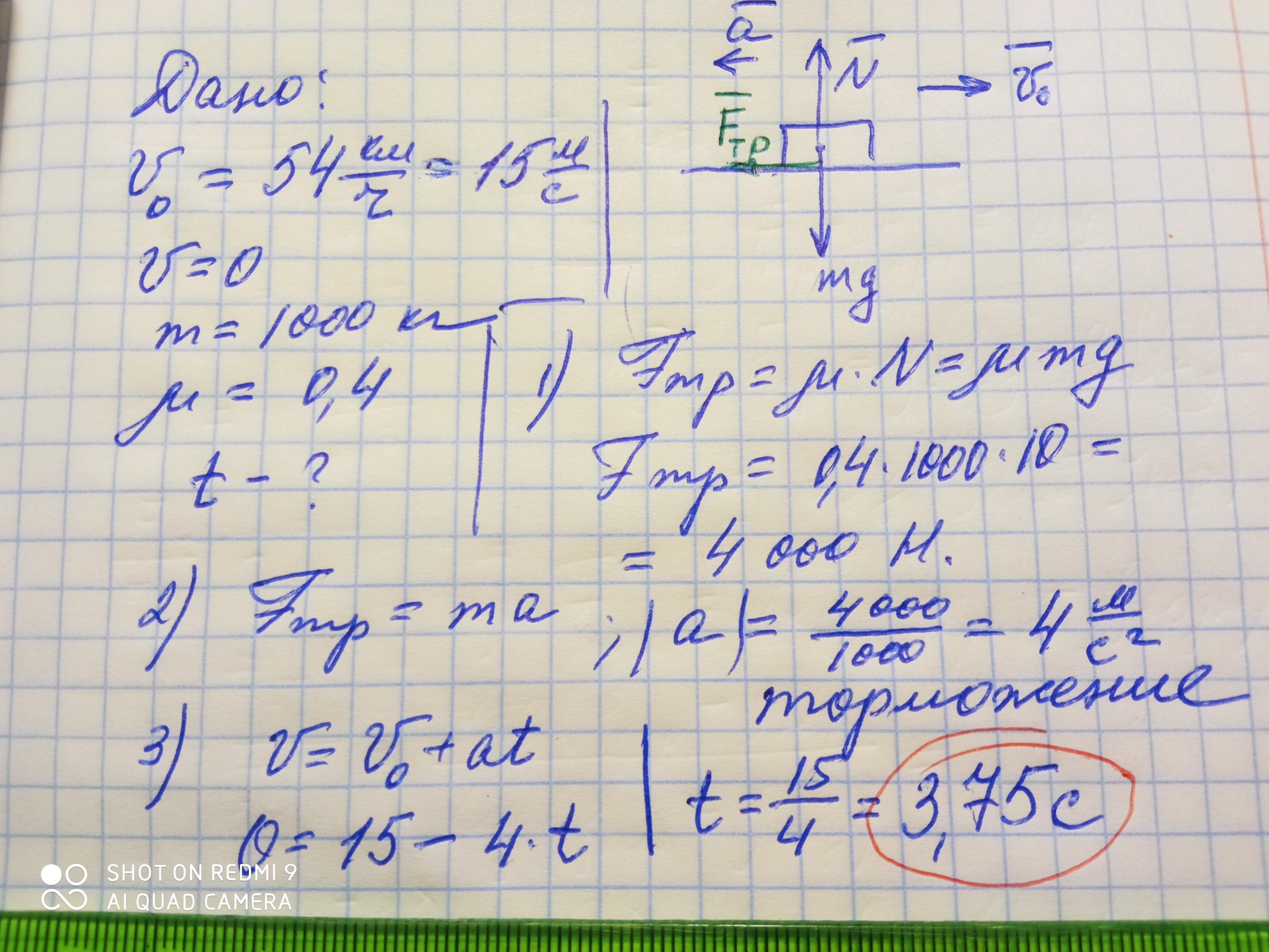 початкова швидкість 54 км/год, маса 1 т, а коефіцієнт тертя 0,4?