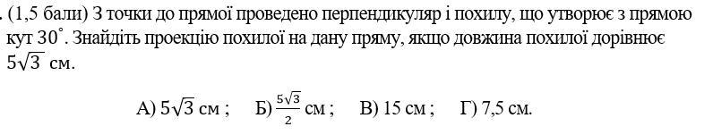 З точки до прямої проведено перпендикуляр і похилу, що утворює з прямою кут 30°.. Знайдіть проекцію похилої на дану пряму, якщо довжина похилої дорівнює 5 √3 см.