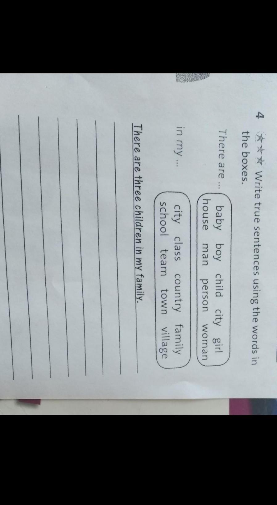 4. *** Write true sentences using the words in the boxes. There are ... baby boy child city girl house person woman man in my ... city class country family school team town village There are three children in my family.