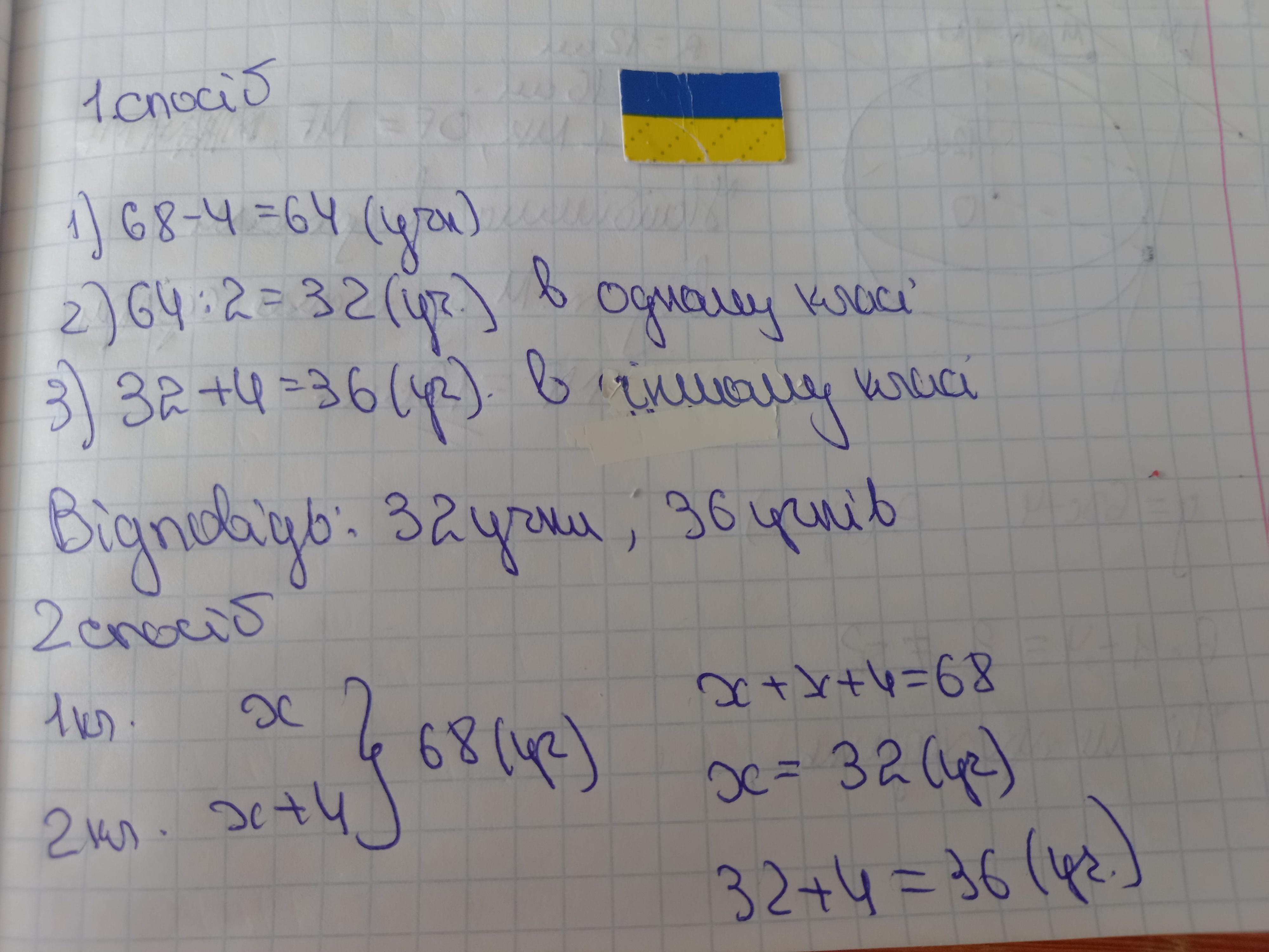 Завдання з логічним навантаженням у двох класах 68 учнів в одному класі на 4 учні більше ніж в іншому скільки учнів у кожному класі