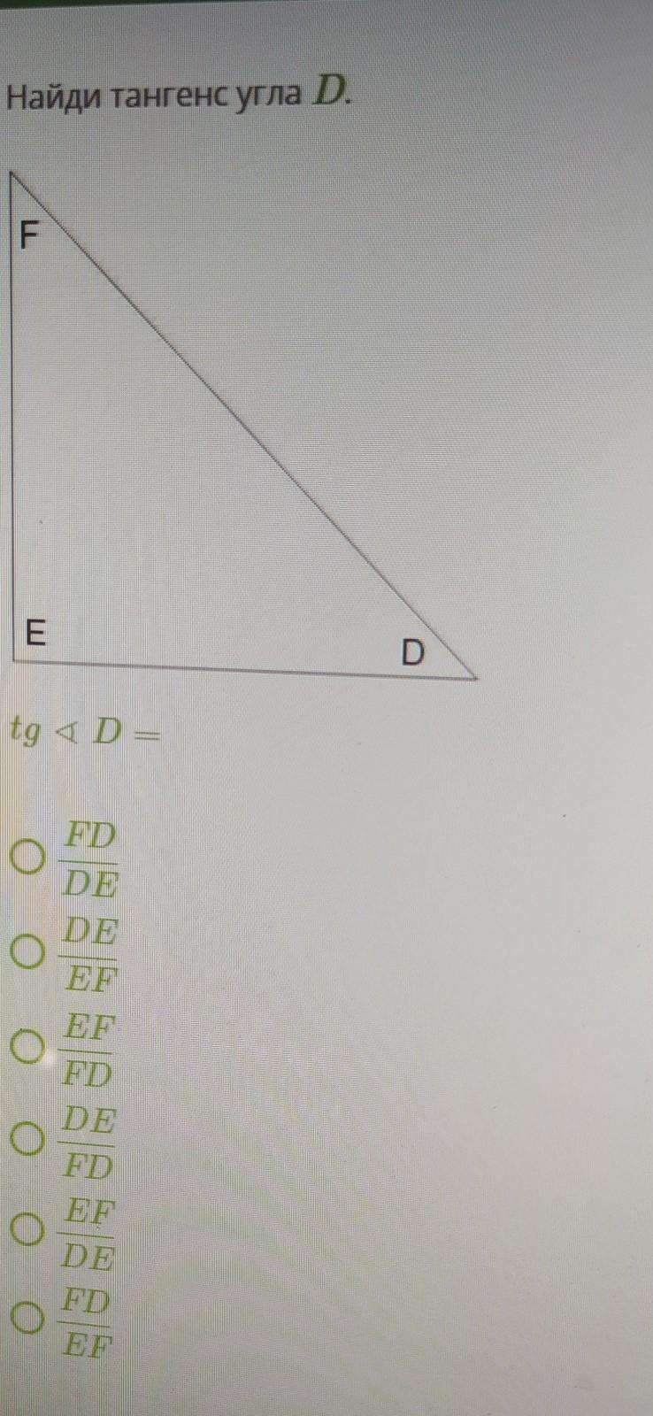 Відповідь: FE/DE; Тангенс гострого кута прямокутного трикутника — відношення катета, протилежного до цього кута, і другого катетакатета