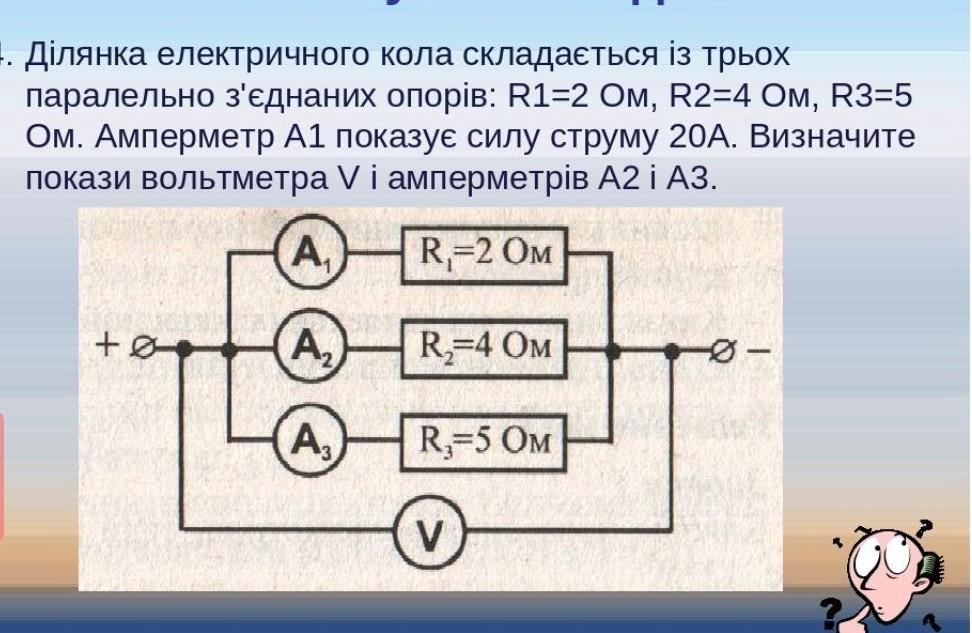 Ділянка електричного кола складається із трьох паралельно з'єднаних опорів: R1=2 Ом, R2=4 Ом, R3=5 Ом. Амперметр А1 показує силу струму 20А. Визначите покази вольтметра V і амперметрів А2 і А3.