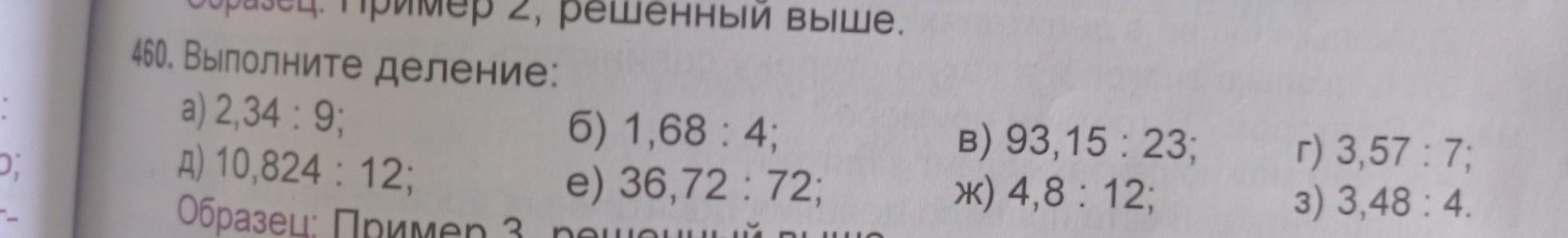 460. Выполните деление: а) 2,34 : 9; 6) 1,68:4; A) 10,824 : 12; е) 36,72 : 72; в) 93,15 : 23; ж) 4,8 : 12; г) 3,57 : 7; 3) 3,48:4. пожалуйста помогите пешите д(з 460