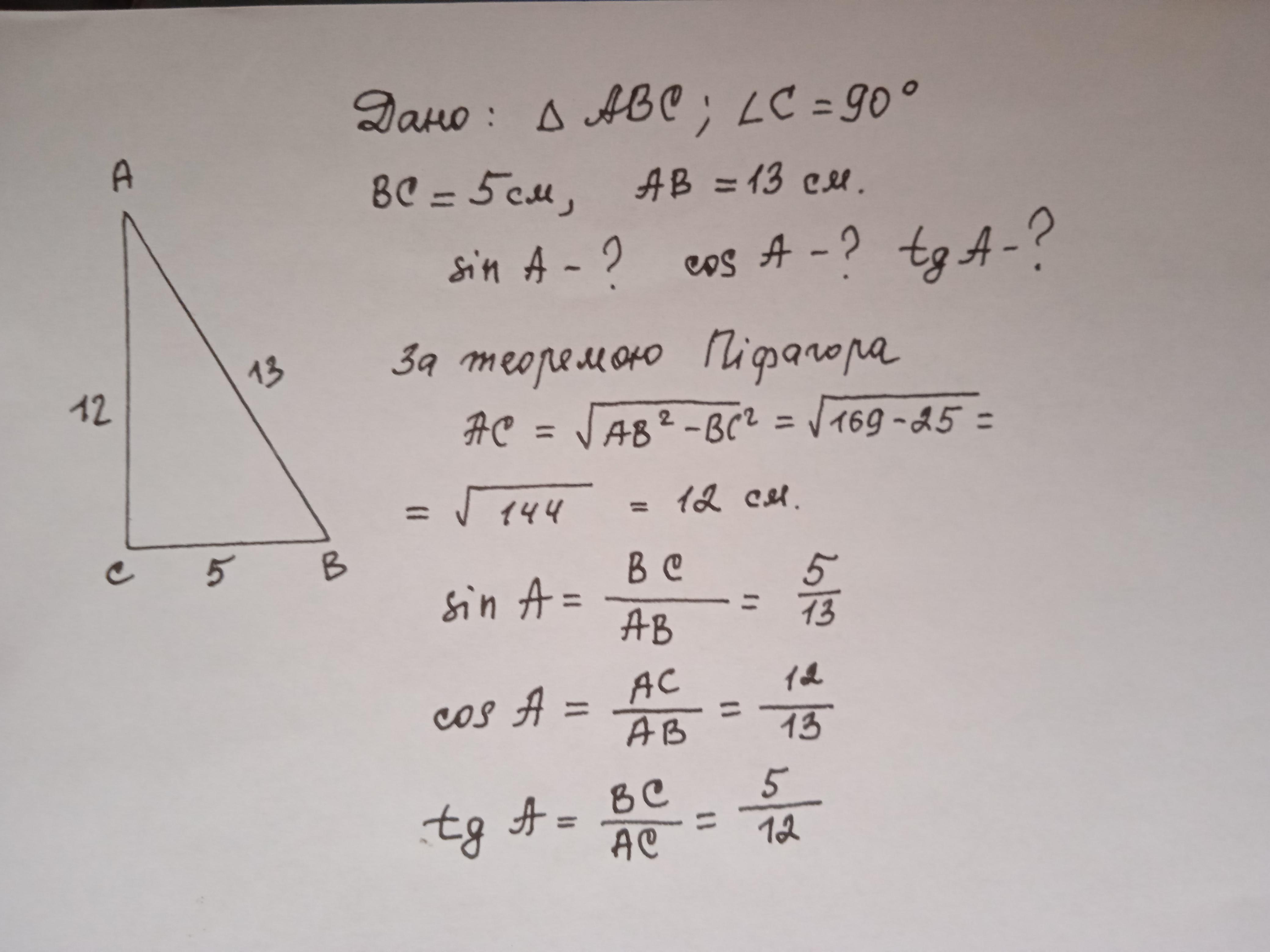 Катет і гіпотенуза прямокутного трикутника відповідно дорівнюють 5см і 13 см.