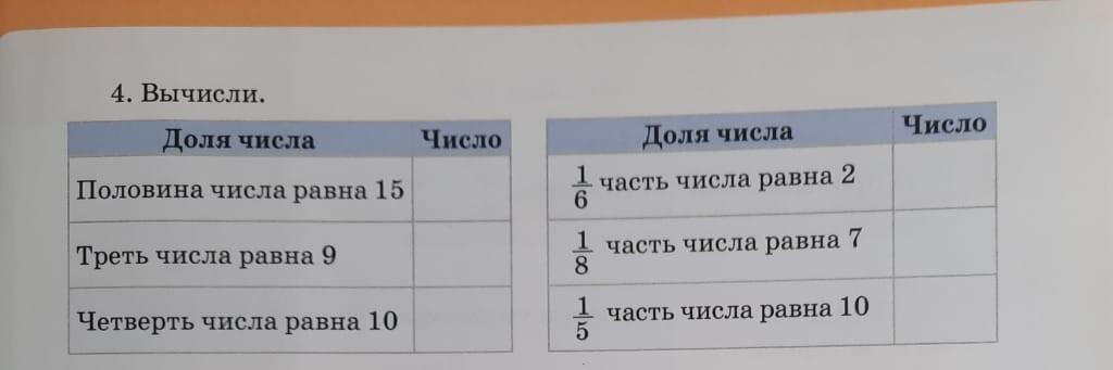 4. Вычисли. Доля числа Число Доля числа Число Половина числа равна 15 Треть числа равна 9 1/6 часть числа равна 2 1/8 часть числа равна 7 Четверть числа равна 10 1/5 часть числа равна 10