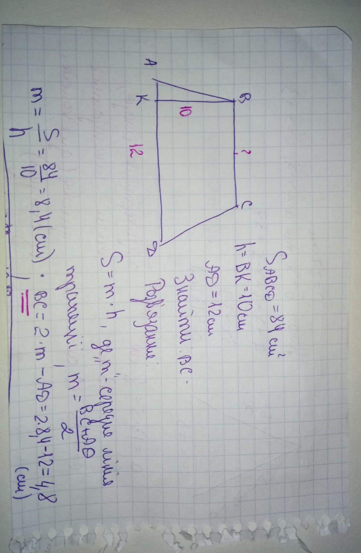 Площа трапеції дорівнює 84см2 ,а висота - 8 . Знайти основи трапеції, якщо одна з них на 5 см більша за другу?