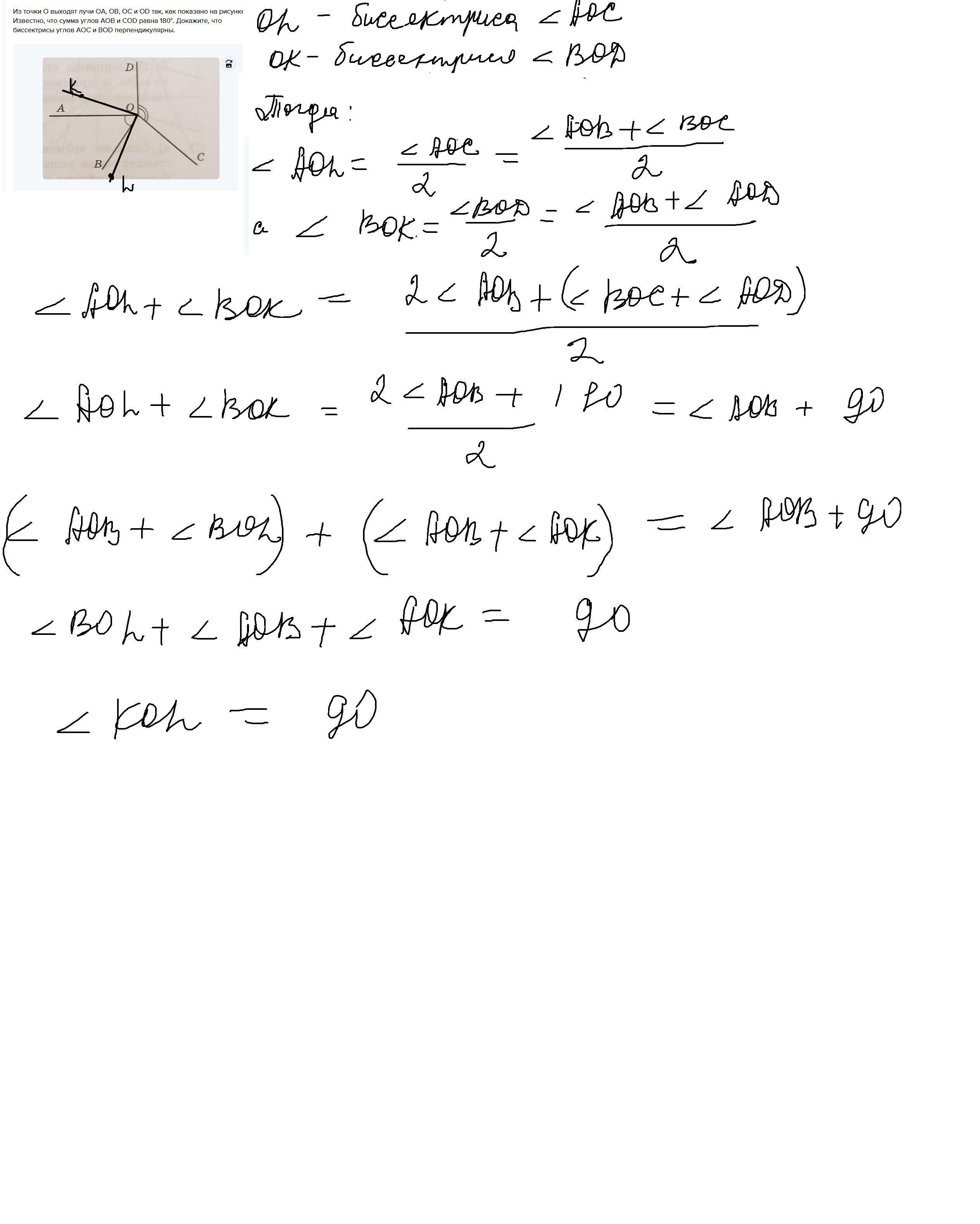 Из точки O выходят лучи OA, OB, OC и OD так, как показано на рисунке. Известно, что сумма углов AOB и COD равна 180°. Докажите, что биссектрисы углов AOC и BOD перпендикулярны.