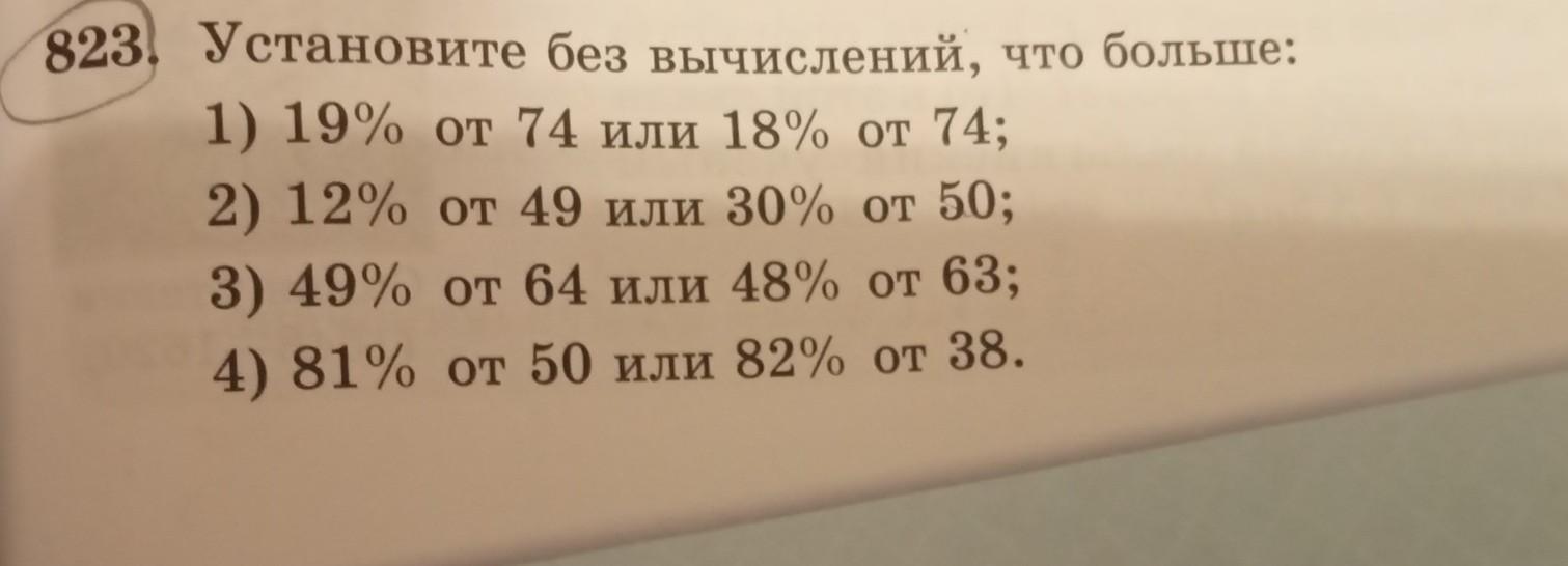 823. Установите без вычислений, что больше: 1) 19% от 74 или 18% от 74; 2) 12% от 49 или 30% от 50; 3) 49% от 64 или 48% от 63; 4) 81% от 50 или 82% от 38.