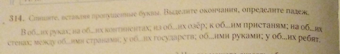 314. Спишите, вставляя пропушенные буквы. Выделите окончания, определите падеж. В об...их руках, на об.. их континентах; из об...их озёр, коб..им пристаням; на обу стенах, между об ими странами; у об. их государств; об...ими руками; у об..их ребяттот кто поможет тебе сделаю ответ лучшим Поставь лайк и подпишись на него О'кей