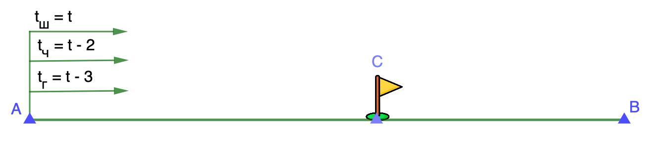 Знаем, что все трое прошли одинаковое расстояние АС, также знаем время каждого. Можем выразить их скорости: