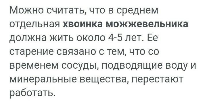 Срок жизни хвои зависит от многих причин. Можно считать, что в среднем отдельная хвоинка можжевельника должна жить около 4-5 лет. Ее старение связано с тем, что со временем сосуды, подводящие воду и минеральные вещества, перестают работать. Накапливаются балластные вещества, и хвоя усыхает.