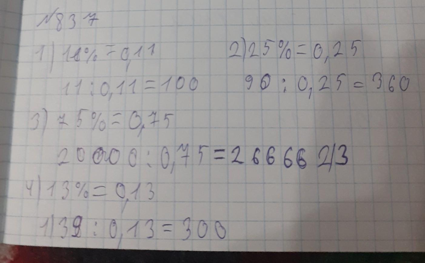 837. Найдите, от какой величины: 1) 11% составляет 11 тг; 2) 25% составляет 90 г; 3) 75% составляет 20 тыс. км; 4) 13% составляет 39 экземпляров.