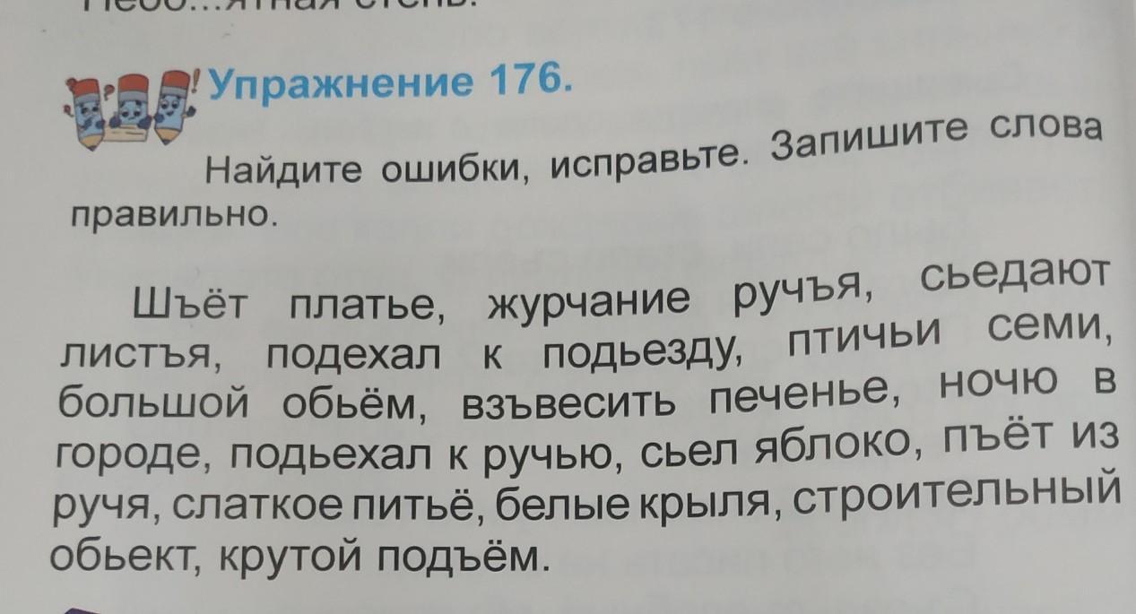 Шьёт платье, журчание ручья, съедают листья, подъехал к подъезду, птичьи семи, большой объём, взвесить печенье, ночью из ручья, сладкое питьё, белые крылья, строительный объект, крутой подъём.