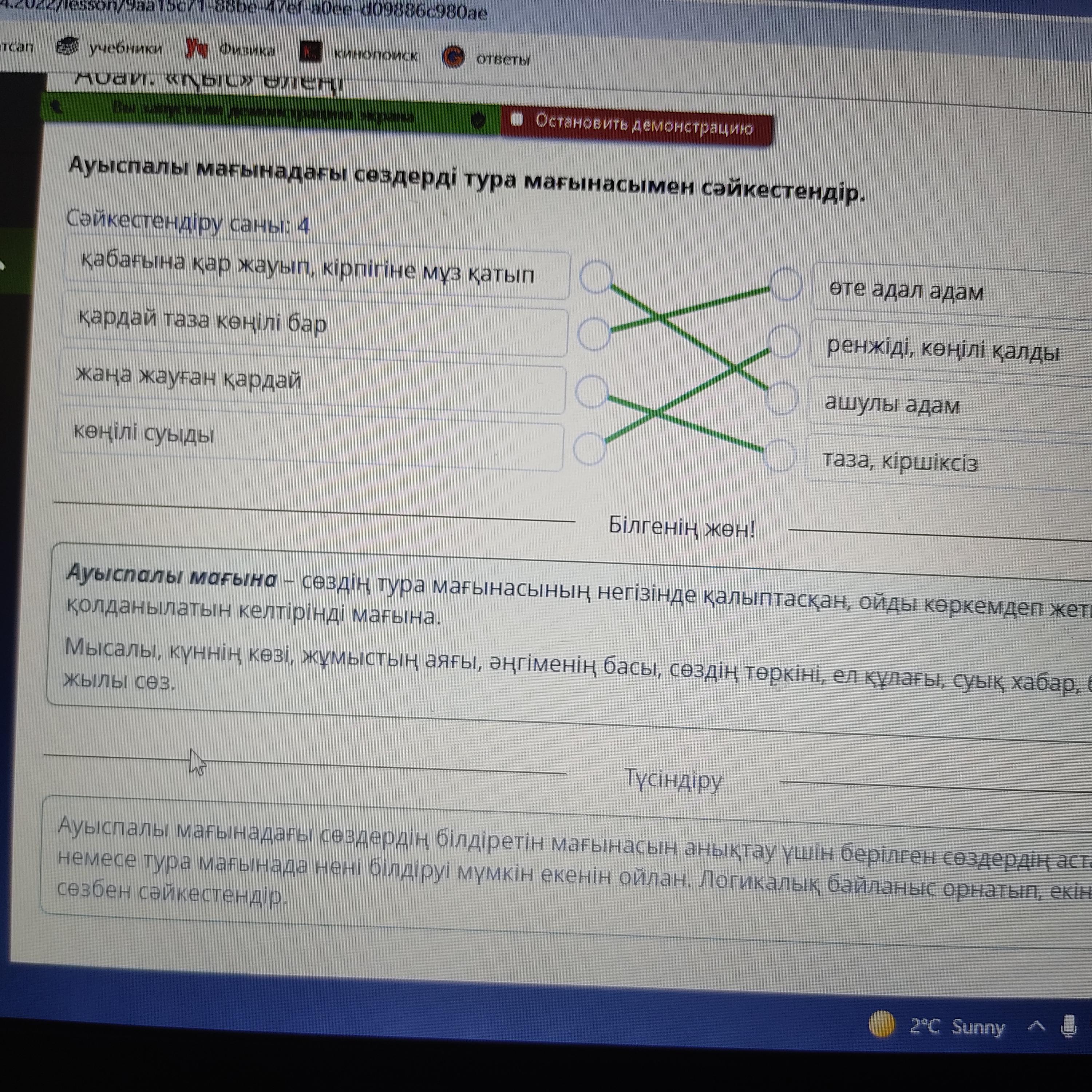 Абай. «Қыс» өлеңі Ауыспалы мағынадағы сөздерді тура мағынасымен сәйкестендір. Сәйкестендіру саны: 4 қабағына қар жауып, кірпігіне мұз қатып қардай таза көңілі бар жаңа жауған қардай көңілі суыды өте адал адам ренжіді, көңілі қалды ашулы адам таза, кіршіксіз
