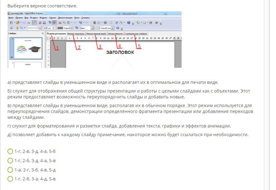 Правильный: 1-г, 2-б, 3-д, 4-а, 5-в
