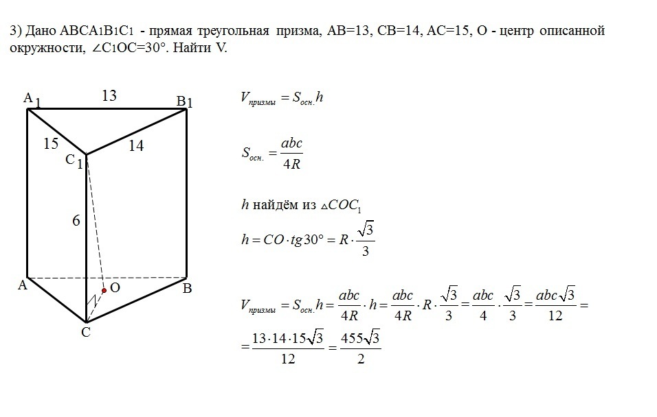 3) Дано ABCA1B1C1 - прямая треугольная призма, AB=13, CB=14, AC=15, O - центр описанной окружности, угол C1OC=30. Найти V.