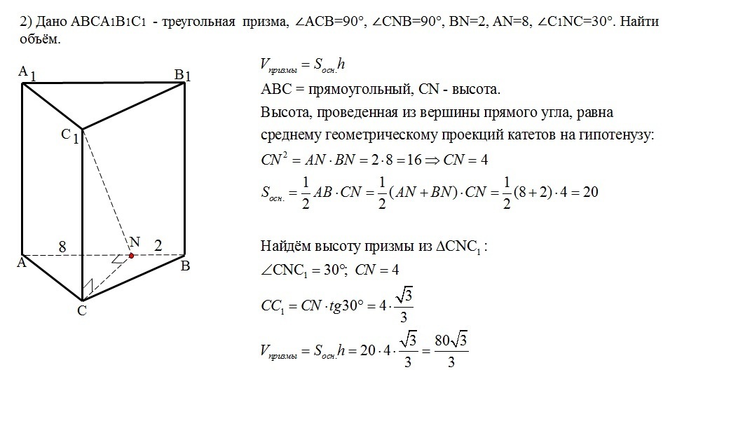 2) Дано ABCA1B1C1 - треугольная призма, угол ACB=90, угол CNB=90, BN=2, AN=8, угол C1NC=30 градусов. Найти объем.