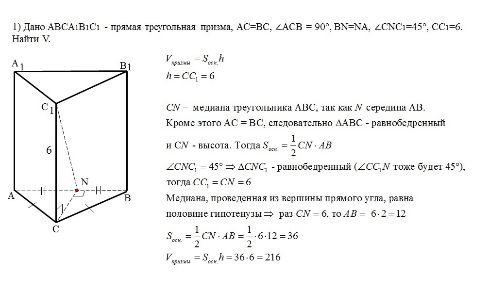 1) Дано ABCA1B1C1 - прямая треугольная призма, AC=BC, угол ACB = 90, BN=NA, угол CNC1=45 градусов, CC1=6. Найти V.