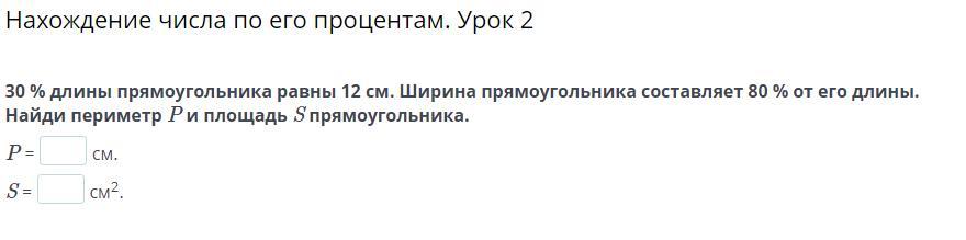 30 % длины прямоугольника равны 12 см. Ширина прямоугольника составляет 80 % от его длины. Найди периметр P и площадь S прямоугольника.