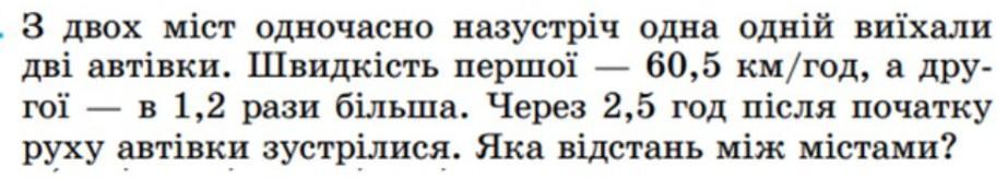 З двох міст одночасно назустріч одна одній виїхали дві автівки. Швидкість першої — 60,5 км/год, а дру- гої — в 1,2 рази більша. Через 2,5 год після початку руху автівки зустрілися. Яка відстань між містами? срочно очень