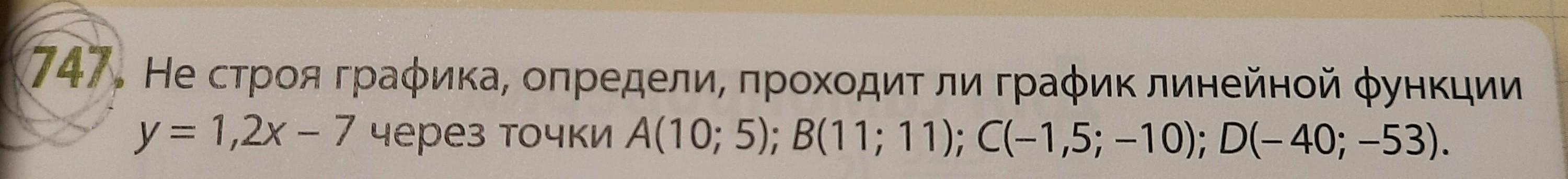 Проходит через точку A(10; 5), не проходит через точки B(11; 11), C(-1,5; -10), D(-40; -53)