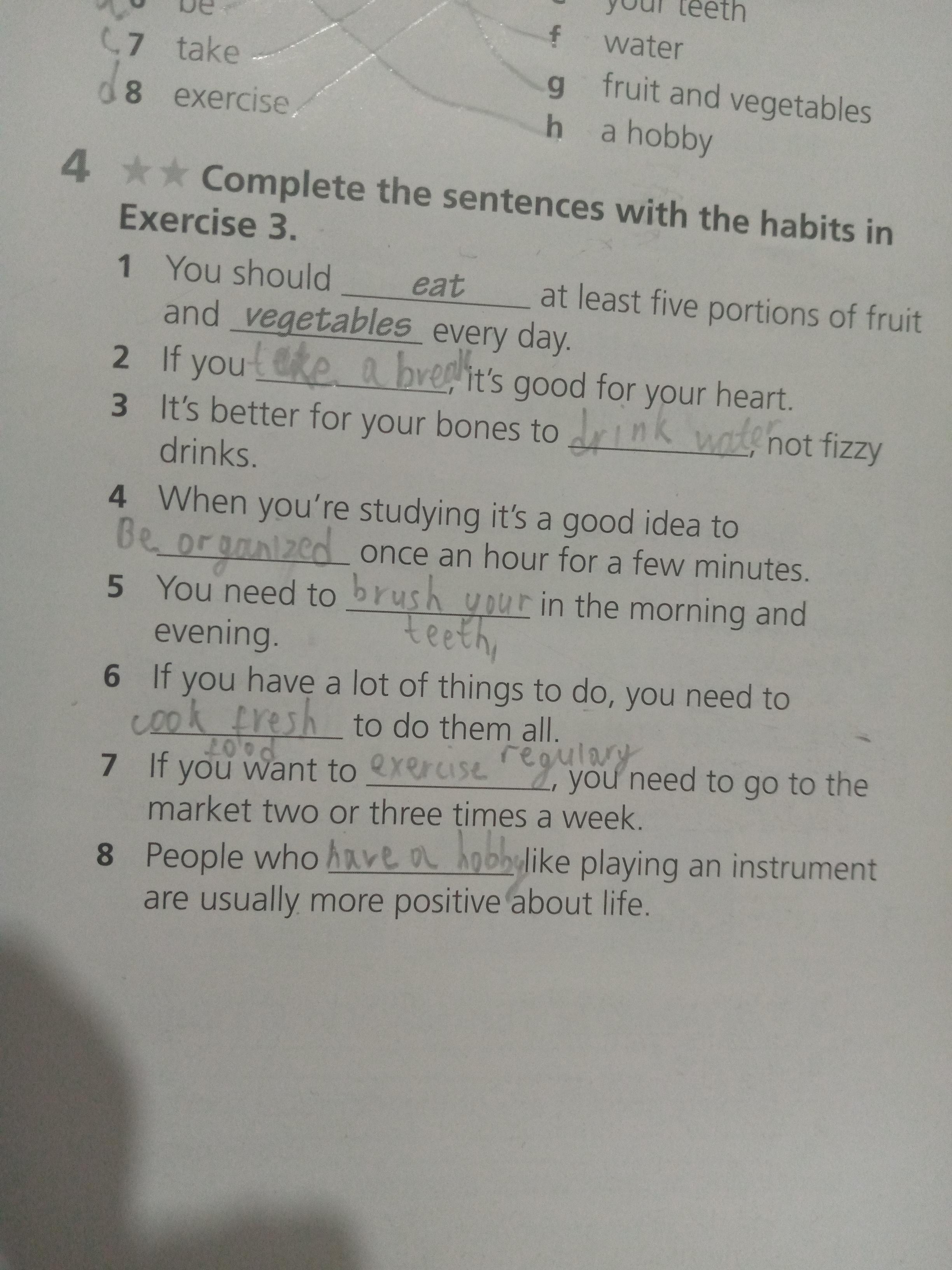 1 aed vegetables 2 take a break 3 drink water 4 be organised 5 brush your teeth 6 cook fresh food 7 exercise regularly 8 have a hobby