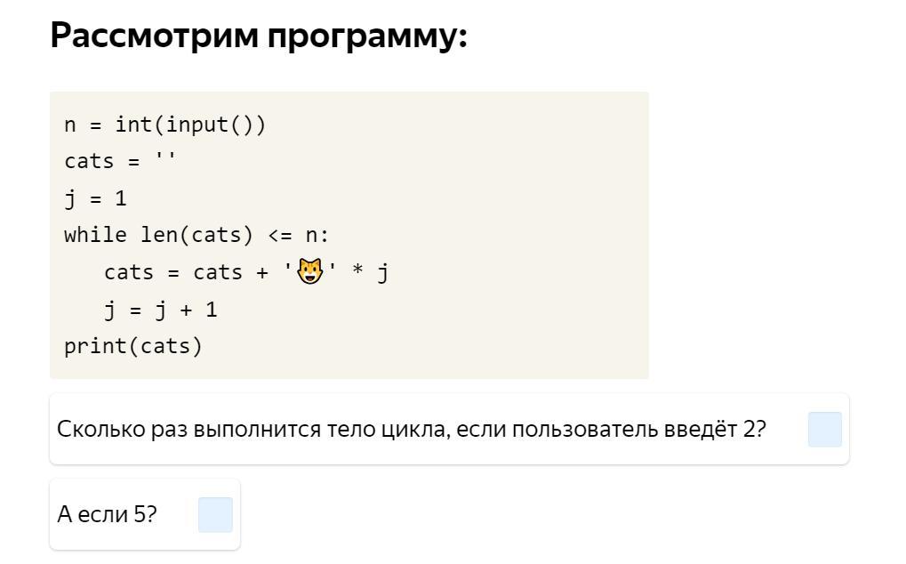 если введено 5, сначала 1 кот, затем 2 котов и, наконец, 3 кота прибавляется, всего 6 котов, 6 больше чем 5 и останавливается цикл, цикл продолжается 3 раза.