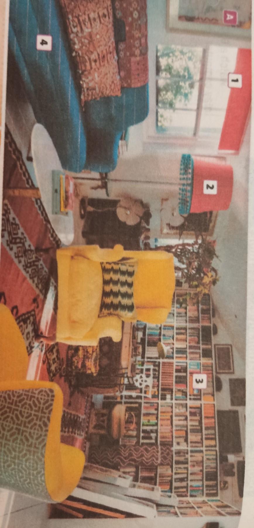 2 lamp 3 bookshelf 4 sofa , and with a lot of green plants . The sofa is blue , the table is white , the carpet is red