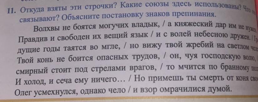 Ответ: Эти строчки мне очень даже знакомы, так как я учила их. Называется произведение «Песень о вещем Олеге».Про союзы тоже вроде легко во втором предложении видим союз «а» относящийся к противительным союзам. Также повторяется несколько раз соединительный союз «и». Есть ещё один противительный союз «но».И последний союз «то» он разделительныйЭти союзы объединяет то, что они относятся к сочинительным союзам.И вот самое моё не любимое пунктуация могу объяснить что перед союзами «а» и «но» запятая ставиться всегда, но следует запомнить что»а» может быть не только союзом но и частицей и междометием.Пример: Ну а я помыла посуду запятая не ставиться.(Простите что не про все запятые сказала, мне пора спать просто…)