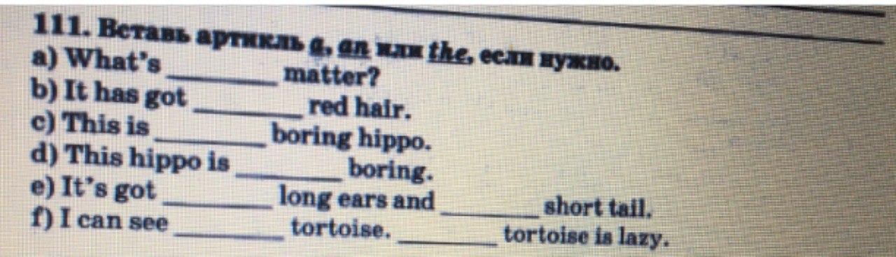 d) This hippo is (-) boring. (перед прилагательными без последующего существительного артикли не используются)