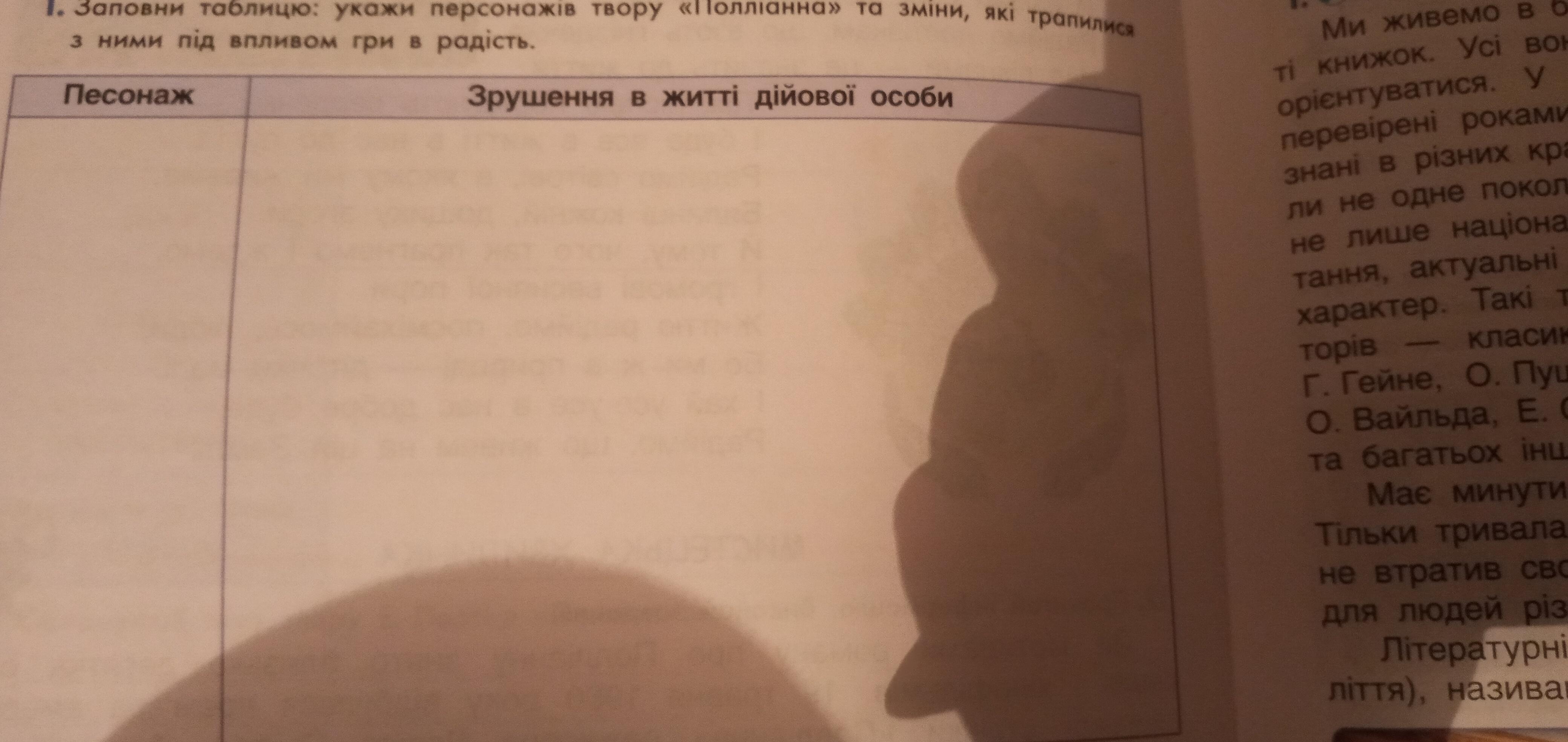 Заповни таблицю: укажи персонажів твору Поліанна та зміни, які трапилися з ними під впливом гри в радість.