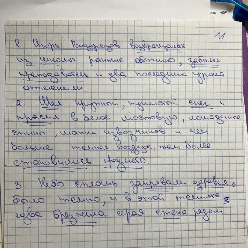 1. Игорь Водорезов возвращался из школы раньше обычного заболел преподаватель и два последних урока отменили. 2. Шёл крупный пушистый снег и красил в белое мостовую лошадиные спины шапки извозчиков и чем больше темнел воздух тем белее становились предметы. 3. Небо сплошь закрывали деревья было темно и в этой темноте едва брезжила серая стена рядом.