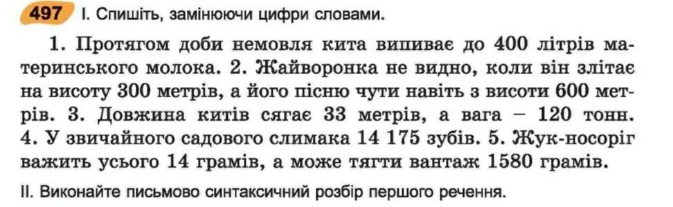 1. Протягом доби немовля кита випиває до чотирьохста літрів материнського молока. 2. Жайворонка не видно, коли він злітає на висоту трьохста метрів, а його пісню чути навіть з висоти шестиста метрів. 3. Довжина китів сягає тридцяти трьох метрів, а вага сто двадцяти тонн. 4. У звичайного садового слимака чотирнадцять тисяч сто сімдесят п'ять зубів. 5. Жук - носоріг важить усього чотирнадцять грамів, а може тягти вантаж тисяча п'ятсот вісімдесят грамів.