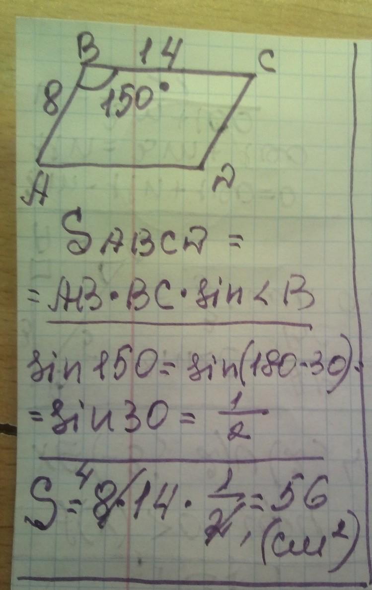 1.Знайдіть площу паралелограма, сторони якого дорівнюють 8 см і 14 см, а кут між ними - 150°.​