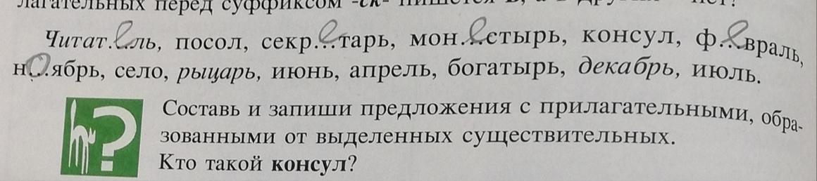 Читатель, посол, секретарь, монастырь, консул, февраль, ноябрь, село, рыцарь, июнь, апрель, богатырь, декабрь, июль.