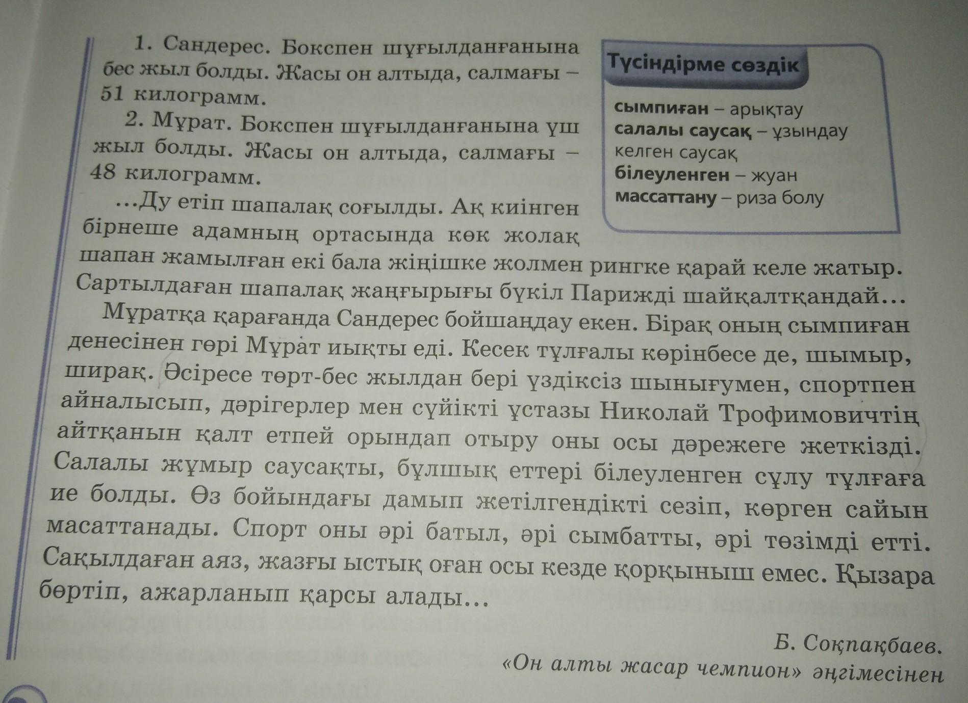 4 - тапсырма Әңгіменің басында Мұрат қандай еді ? Мұраттың сырт келбетін , іс - әрекет терін салыстырып , боксшының өсу жолы туралы шағын мәтін жазыңыздар .