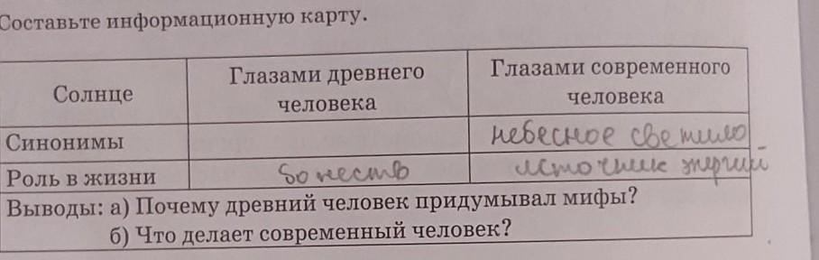 2) Составьте информационную карту. Глазами древнего Глазами современного Солнце человека человека Синонимы небесно се мо Роль в жизни So necmo LCD " Оше при Выводы: а) Почему древний человек придумывал мифы? б) Что делает современный человек?