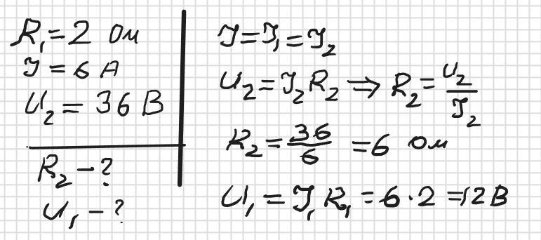 Два провідники з’єднані послідовно,опір першого дорівнює 2 Ом, сила струму в колі рівна 6А, напруга на другому провіднику 36В. Знайдіть опір другого провідника та напругу на першому.